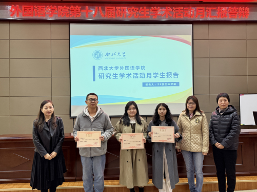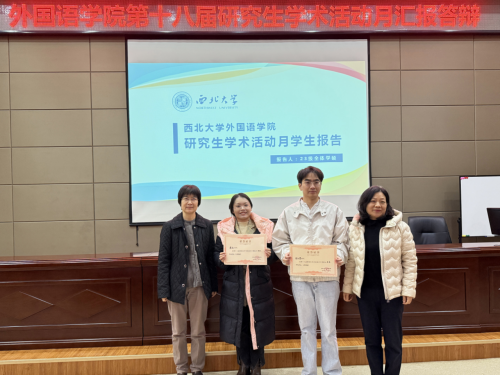 In this academic month report defense, there were first, second, and third prizes, with six awards in total. The papers were initially screened and scored, and the final evaluation was based on the defense performance combined with the scores from the written papers. After comprehensive scoring, the judges selected the award-winning students for this year's Graduate Academic Activities Month. The final results were as follows: Wang Yiqun, a student from the 2023 cohort in Foreign Linguistics and Applied Linguistics, won first place; Xu Yun'en from Foreign Linguistics and Applied Linguistics and Huang Li from Country and Region Studies won second place; and Hu Gang from Country and Region Studies, Zhang Yujun, and Yu Wenjing from Foreign Linguistics and Applied Linguistics won third place. Finally, the attending faculty members presented awards to the winning students, and a group photo was taken with all faculty and students. The Graduate Academic Activities Month Report Defense concluded successfully!
