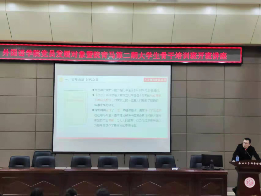 为全面贯彻学习党的十九届六中全会精神,12月3日下午,学院党委邀请了马克思主义学院副教授、西北大学青年讲师团成员、全国教学能手赵沛老师和学院党委书记王军老师开展了学习党的十九届六中全会精神专题讲座,学院2021年下半年发展对象和院青马第二期学员共80余人参加了此次讲座,讲座由学院党委委员、团委书记曹智主持。