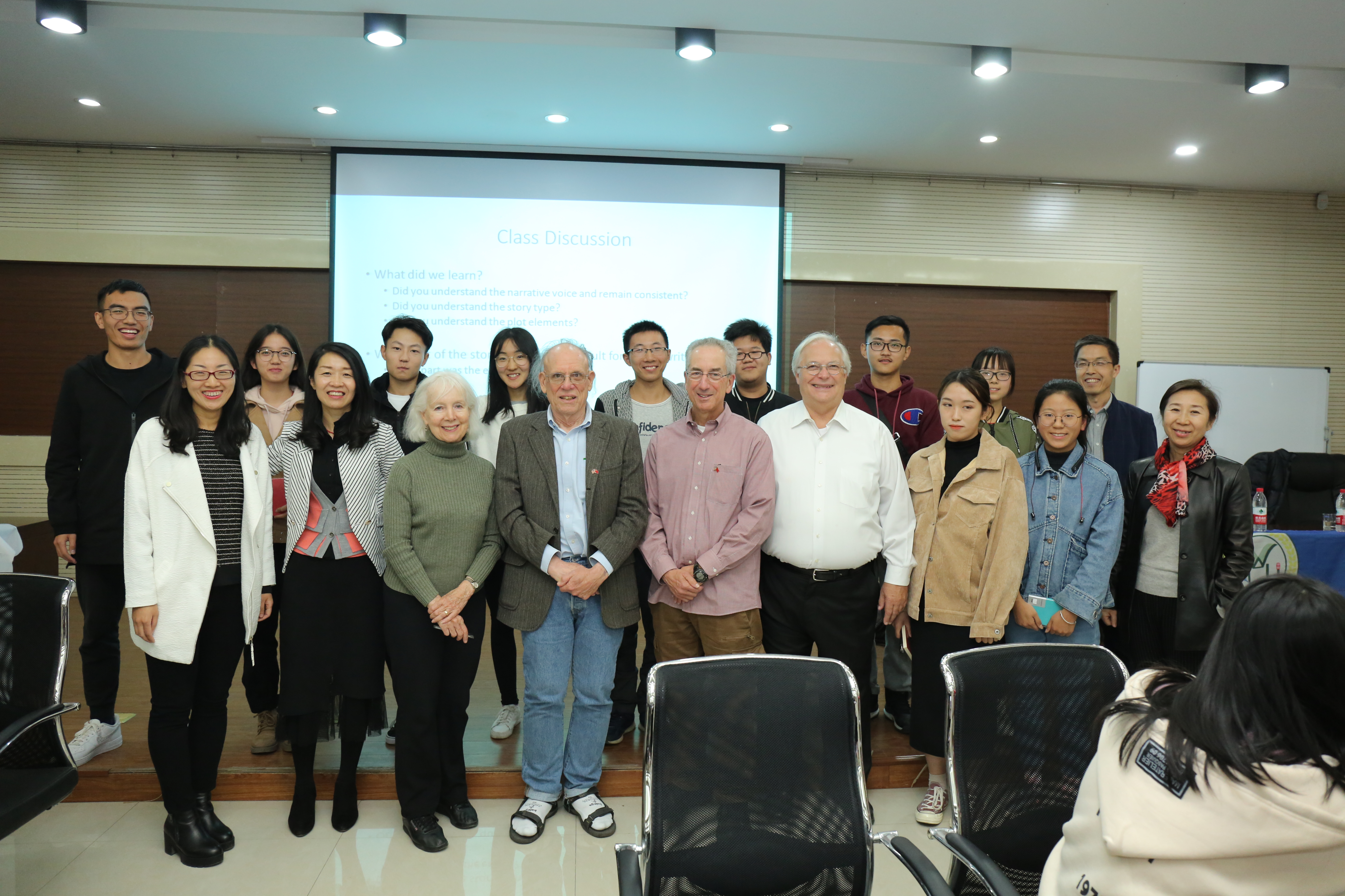 2018年10月25日下午,在教学副院长曹若男和4位美国志愿者的大力支持下,我院西北大学读写演讲训练基地写作中心在口译模拟实验室举办了创意写作沙龙活动。此次活动由写作中心团队教师许娜负责主持,团队其他教师成员贾琼、李艳(小)和邵润平参与组织,有近70名学生参加了活动。