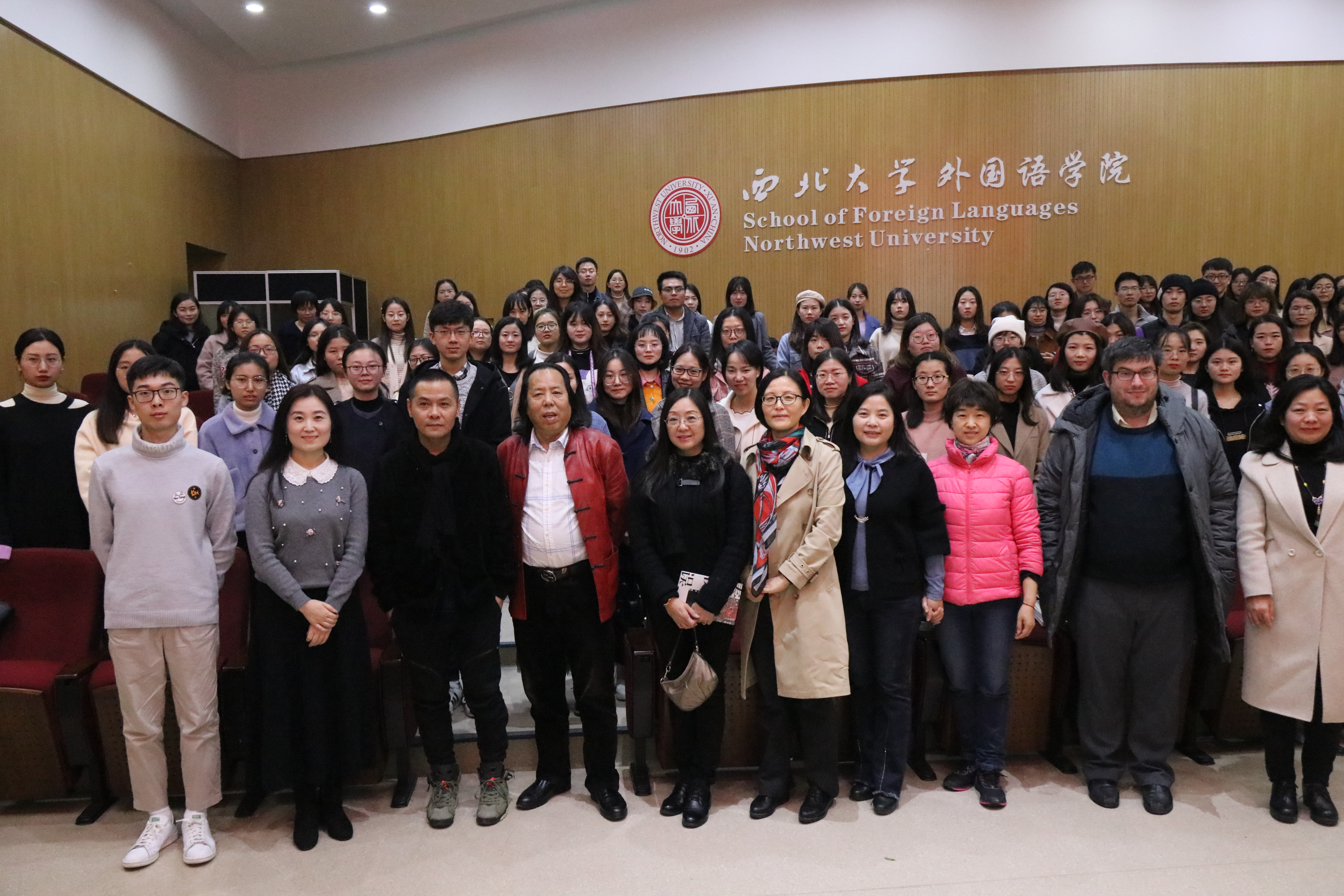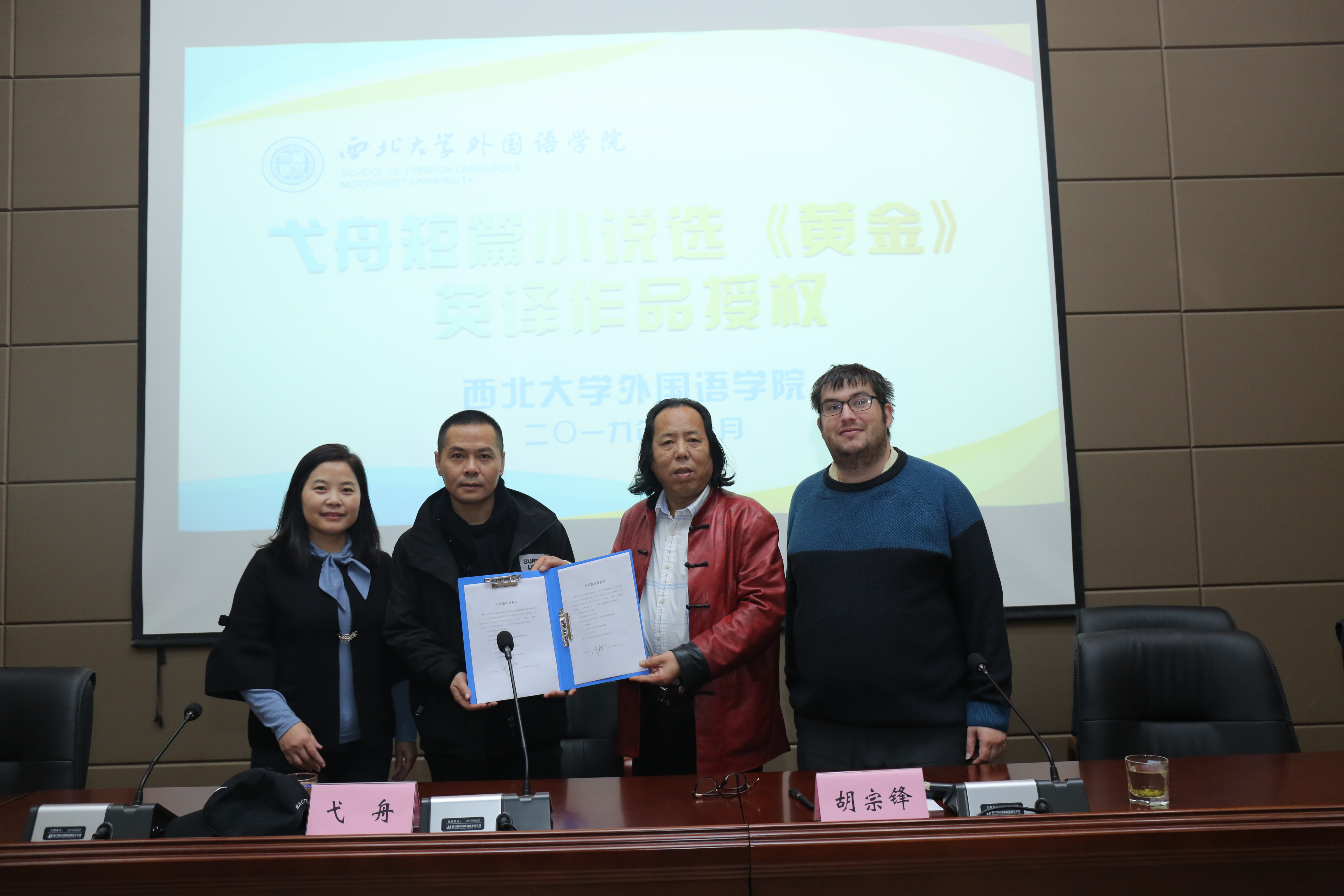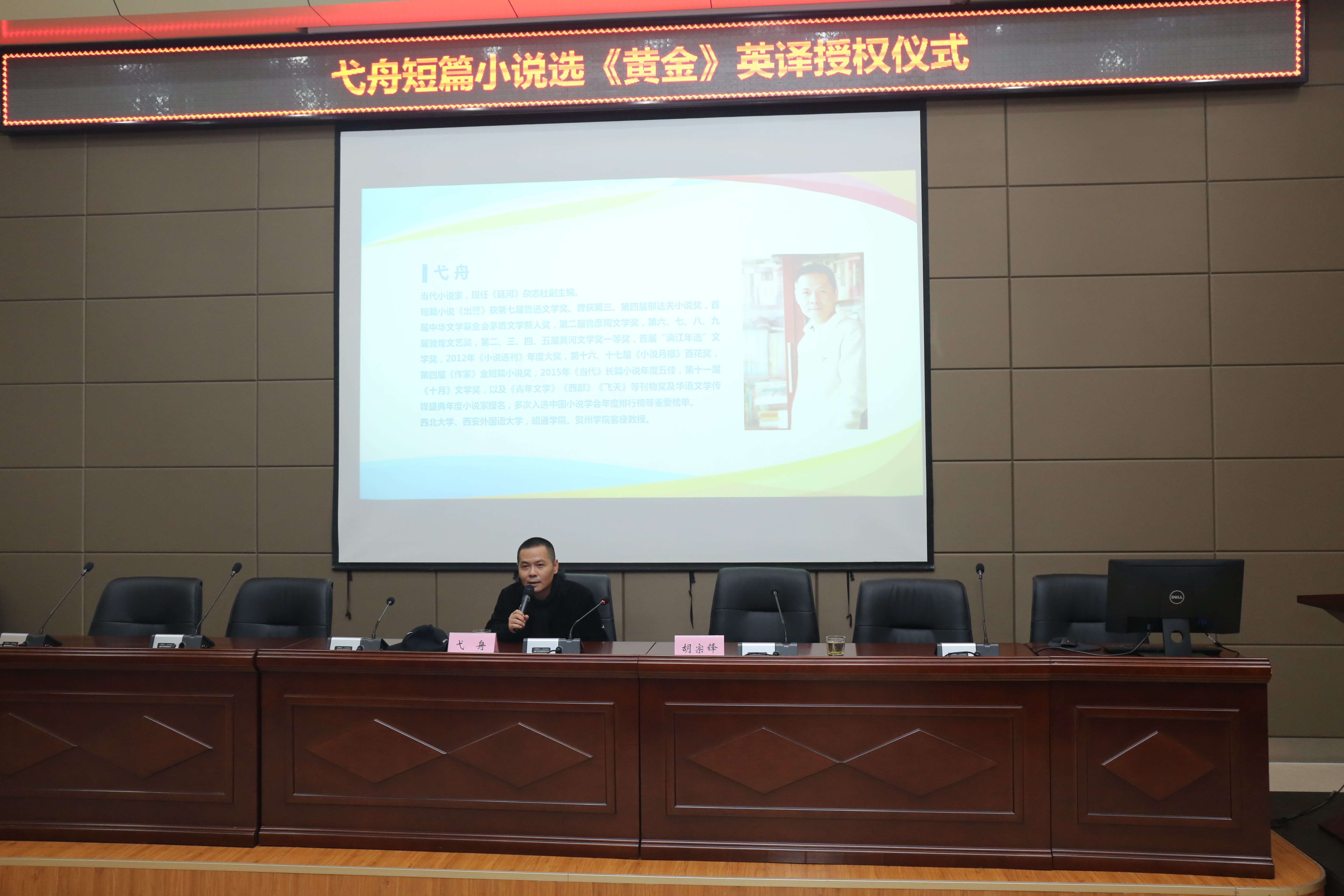11月6日下午,《延河》杂志社副主编、第七届鲁迅文学奖得主——弋舟先生的短篇小说选《黄金》英译授权仪式在我院第二课堂报告厅举行。我院胡宗锋教授、苏蕊副教授、罗宾副教授等主要译者出席。授权仪式之后,弋舟为我院师生做了题为“建构我们文学的世界”的主题报告,报告由我院院长胡宗锋教授主持,数百名师生参会。