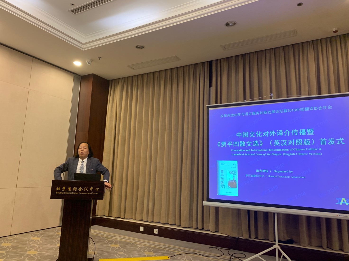 应中国翻译协会邀请,陕西省翻译协会在“改革开放40年与语言服务创新发展论坛暨2018中国翻译协会年会”上承办中国文化对外译介传播主题论坛暨《贾平凹散文集》(汉英对照版)首发式。