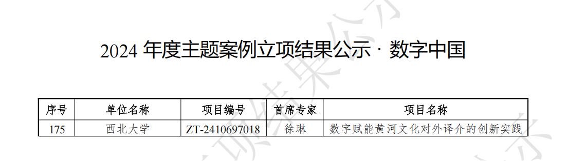 3月28日,教育部学位与研究生教育发展中心公示了2024年度中国专业学位案例中心主题案例立项,我院教师徐琳申报的“数字赋能黄河文化对外译介的创新实践”获批主题案例。