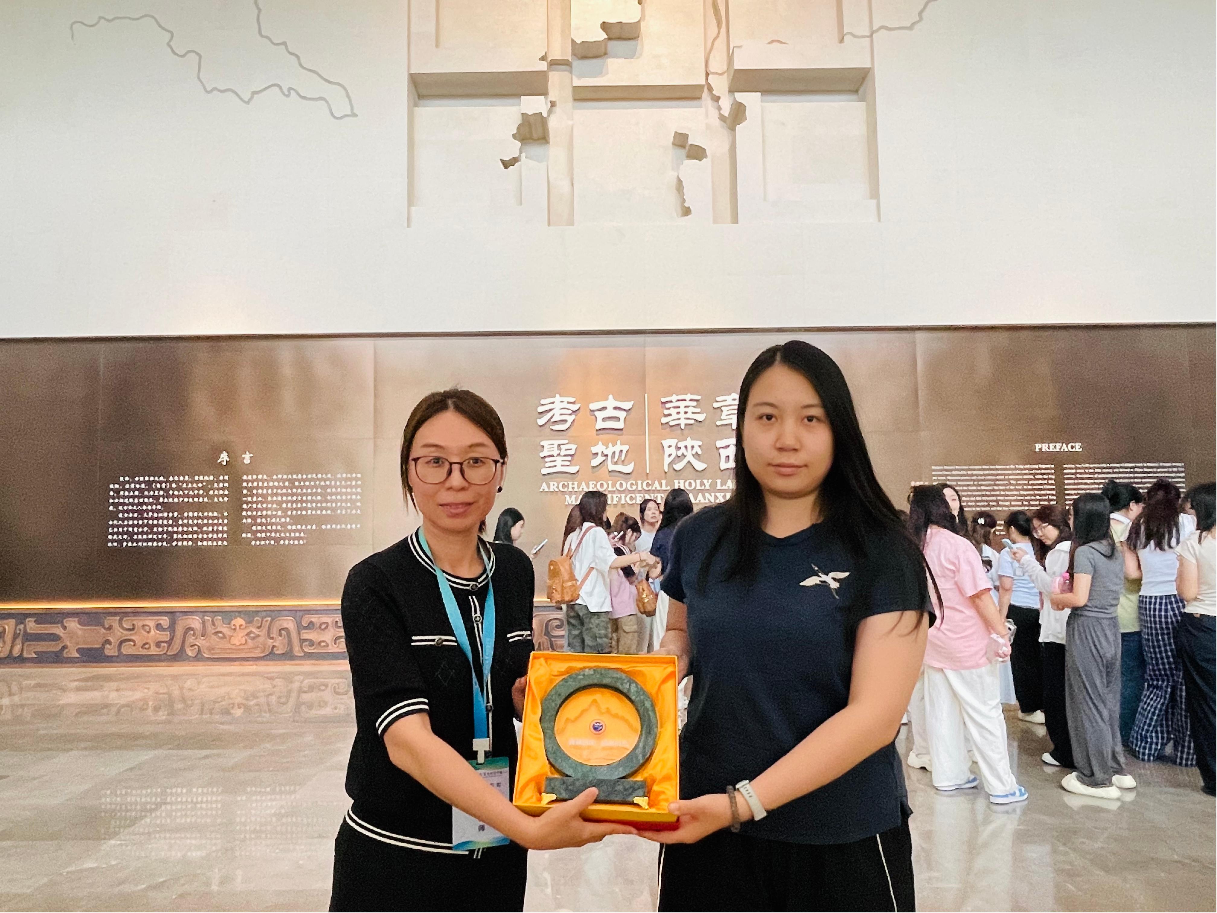 在讲解员闫韵竹的全程引导下,学生依次参观了文物展区与遗址保护大厅,系统了解了半坡文化的生产生活与社会组织。结束参观后,师生来到博物馆接待厅,同半坡博物馆师瑞玲主任、朱振华主任、闫韵竹讲解员一同研讨并进行文化外宣学习。师主任从自身经历出发,鼓励学生勇于追求机会,在实践中锻炼自我;朱主任鼓励学生来馆实习或担任志愿者,发挥MTI专业优势,在文遗外宣实践中体会当代年轻人讲好中国故事的使命;闫韵竹讲解员结合自身工作经验,指出英文讲解词并不是简单地将中文讲解词翻译为英文,而应当充分考虑中西不同的思维方式,将讲解词英译为适合讲解的短句。交流后,由何花代表学院向西安半坡博物馆赠送了纪念品。