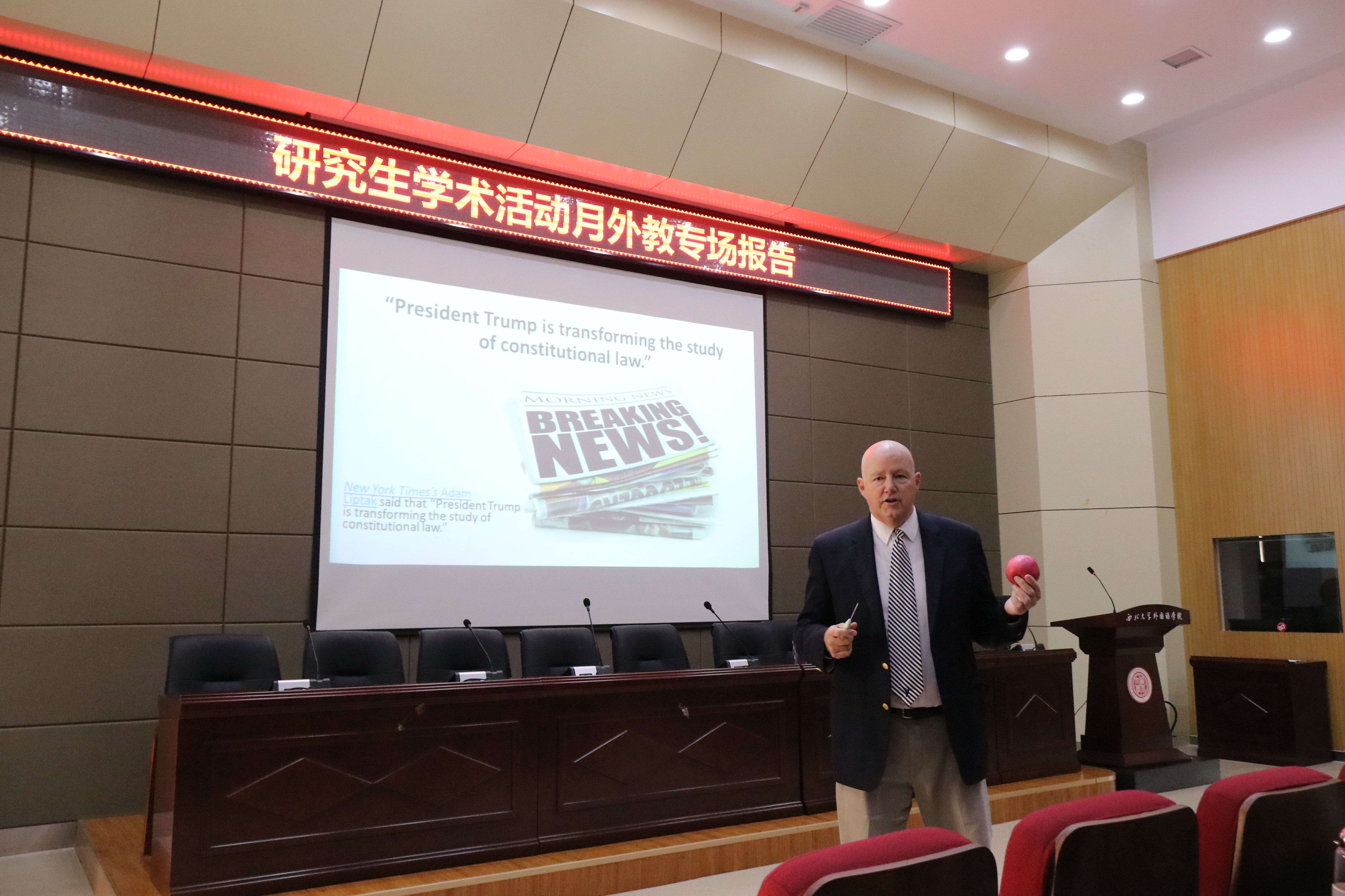 Kenneth Hunt(肯尼思·亨特)作了题为“美国宪法如何限制总统特朗普的权力”的报告。他表示,美国实行三权分立,其宪法设计了一个不允许任何权力分支部门掌握全部政府权力,同时又能整体而有效地推进政府工作的权力关系模式。根据宪法,国会有权要求总统条陈政策以备审议,有权建议、批准总统对其所属行政官员的任命,有权批准总统对外缔结的条约等,这些都体现了而体现了国会对总统的制约。因此,他认为,人们不必夸大特朗普对美国宪政体系的冲击,三权分立原则决定了特朗普不可能改变美国宪政基础。