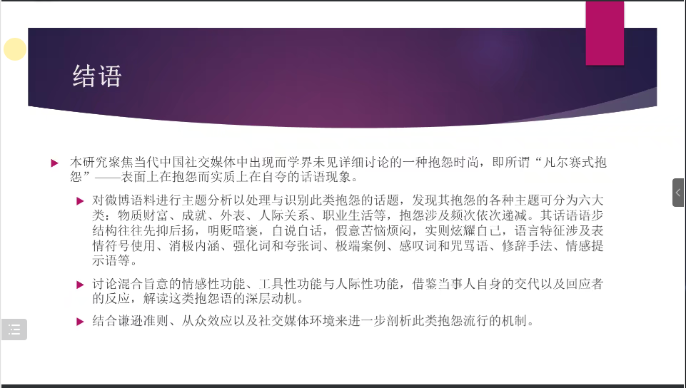 之后,陈新仁教授列出了三个研究问题和三个研究目标,并讲述了运用主题分析法对收集数据进行具体分析的方法论。在结果与讨论这部分,陈新仁教授主要总结了“凡尔赛式”抱怨语的语用特征和这类抱怨话语的动机以及其引发的回应。此外,陈新仁教授还阐释了这类抱怨话语发生的社会文化语境和社交媒体根源,并从社会文化谦逊原则、从众效应和社交媒体因素三方面做了解释说明。最后,陈新仁教授的总结和展望带给了大家许多思路启发。