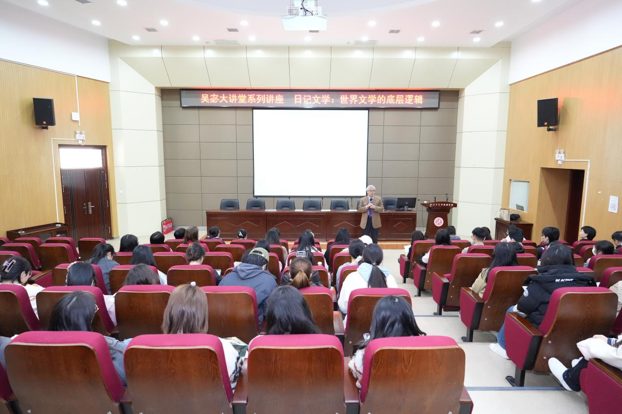 2025年3月28日下午,北京大学外语学院教授、博士生导师、北京大学世界传记研究中心主任、跨文化研究中心秘书长、中外传记文学研究会会长、世界文学学会会长、世界生态文化组织主席、国际传记文学学会创始人、中国东盟跨文化研究院创始人赵白生教授做客西北大学“名家讲坛”暨外国语学院“吴宓大讲堂”第一讲,为师生作了题为《日记文学:世界文学的底层逻辑 ——<吴宓日记>深度剖析》的讲座。讲座由外国语学院副院长苏蕊主持。校内约一百一十名师生聆听了讲座。