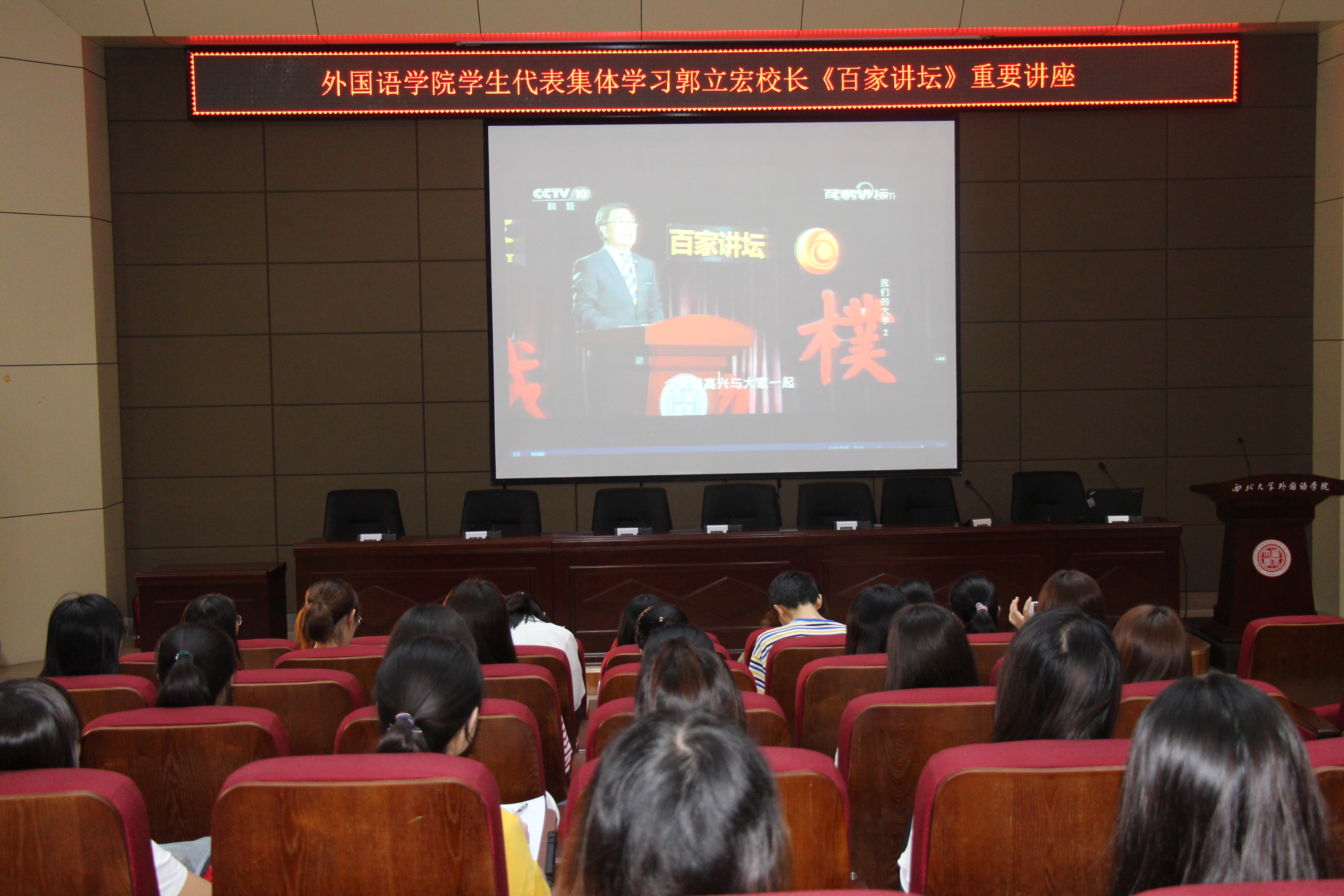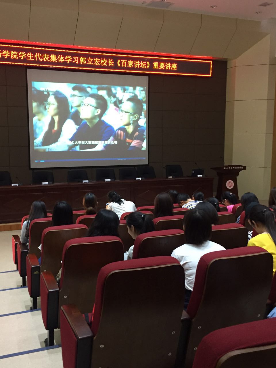 《百家讲坛》栏目组首次走进大学,由大学校长主讲开学第一课。2017年9月11日中午,我院师生聚集在第二课堂报告厅,观看了郭立宏校长《百家讲坛》重要讲座——大与小,谈谈我的大学观。郭校长对大学独到理解让学生们更加深刻地领悟到大学的作用,感受到西北大学 “公诚勤朴” 之精神,对于指导学生度过精彩的大学时光具有重要意义。