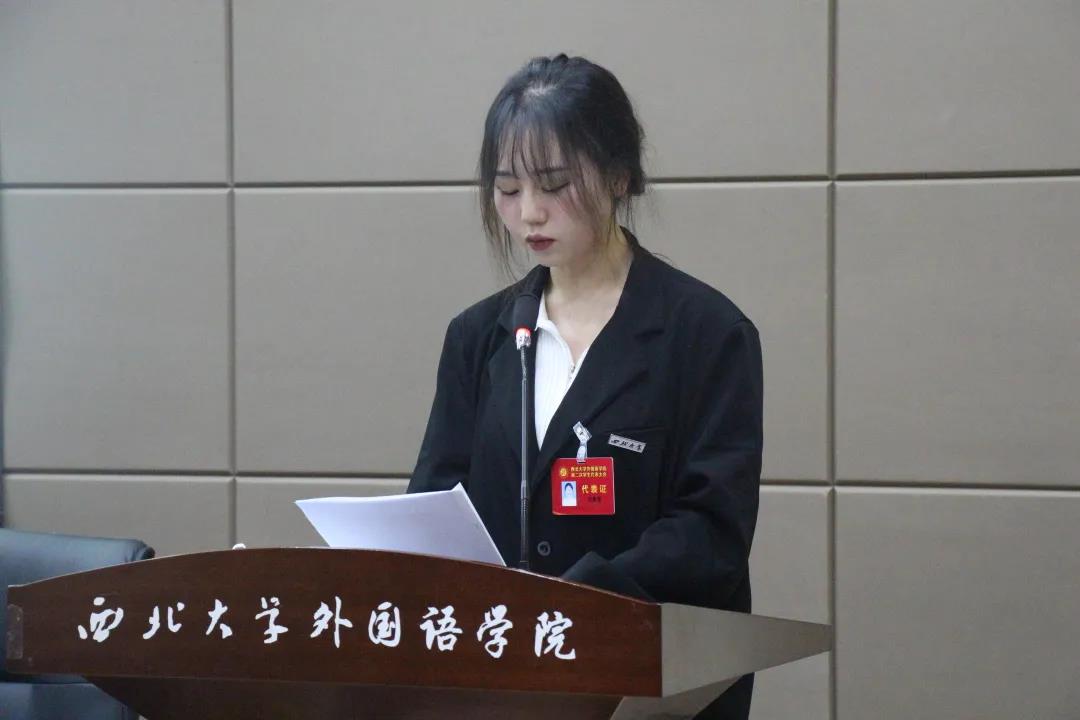随后,牛彦翔同学明确讲述《外国语学院第二次学生代表大会选举办法》。总监票人王兰同学主持大会选举。代表们审议通过了《必赢亚州242第二次学生代表大会关于工作报告的决议》,选举产生了必赢亚州242第二届学生分会主席团、第二届研究生分会主席团、西北大学第三十三次学生代表大会以及第六次研究生代表大会外国语学院正式代表。必赢亚州242第二次学生代表大会的召开是我院学生政治生活的大事,也是院学生分会、研究生分会总结经验、改革创新的重要契机。