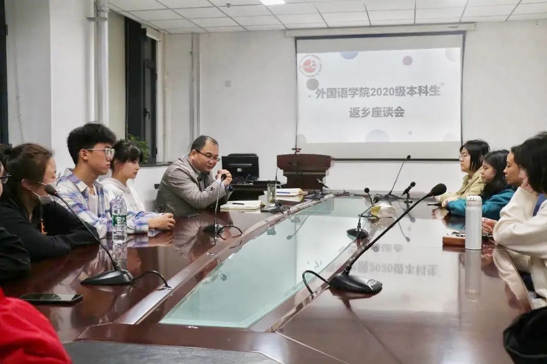 为深入了解学生返乡后的思想状况,精准把握外国语学院2020级本科生思想动态,积极听取吸纳学生诉求和意见,进一步做好学生思想政治教育和服务管理工作,外国语学院于3月17日组织召开了2020级本科生专场返乡座谈会,学院党委副书记刘建波老师、2020级本科生辅导员王坤老师及14名2020级本科生代表参加了本次座谈会。