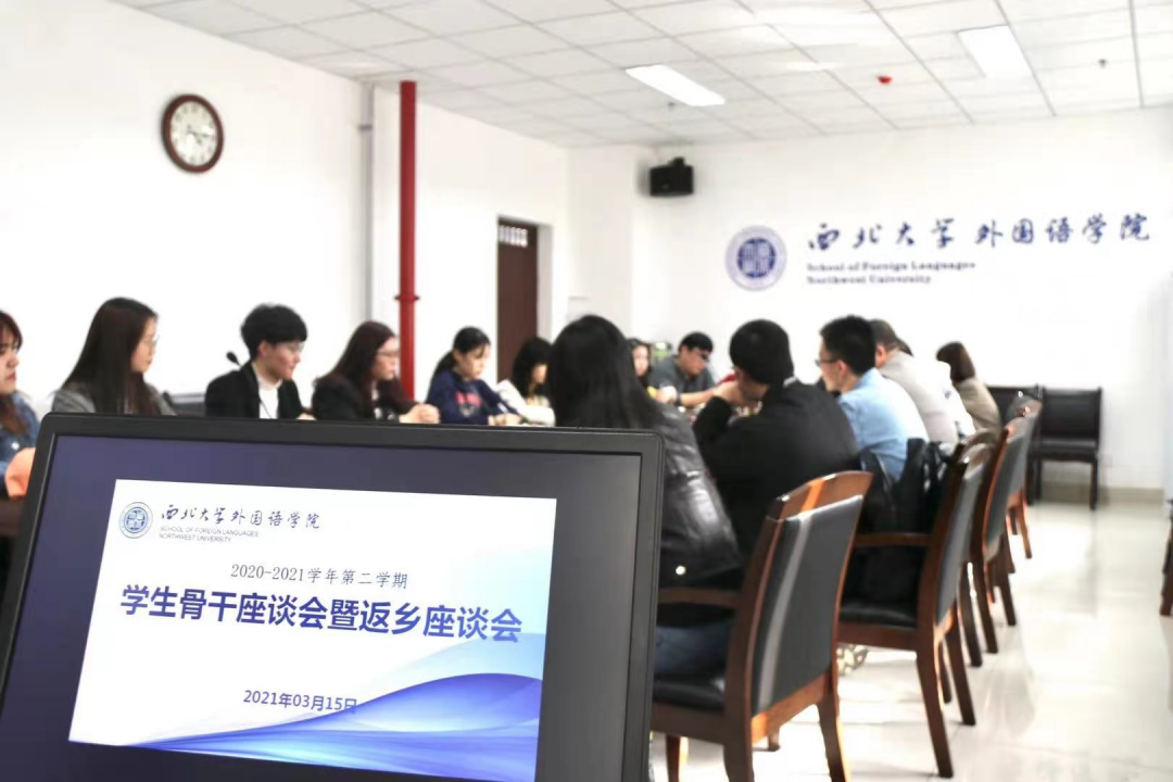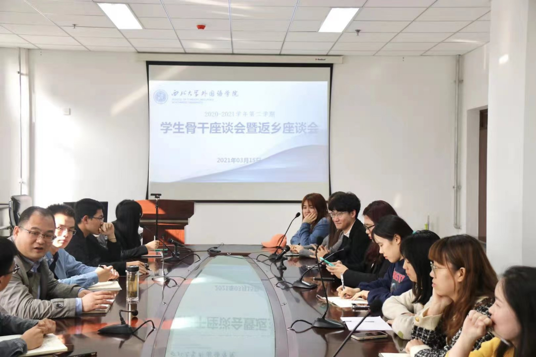 为深入了解学生返乡后的思想状况,了解学生诉求和意见,进一步做好学生思想政治教育和服务管理工作,外国语学院根据学校相关安排,于3月15日下午四点组织召开了学生骨干座谈暨返乡座谈会,学院党委副书记刘建波老师、本科生辅导员赵明星、马圣渤老师、院学生会、心协学生干部以及本硕各年级学生代表共二十余人参加了本次座谈会。