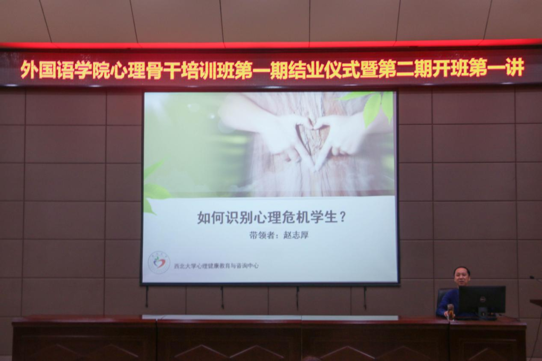 会上,校心理中心副主任张文芳老师进行致辞,学院党委书记赵志厚老师为外国语学院心理骨干培训班第二期学员作开班第一讲。