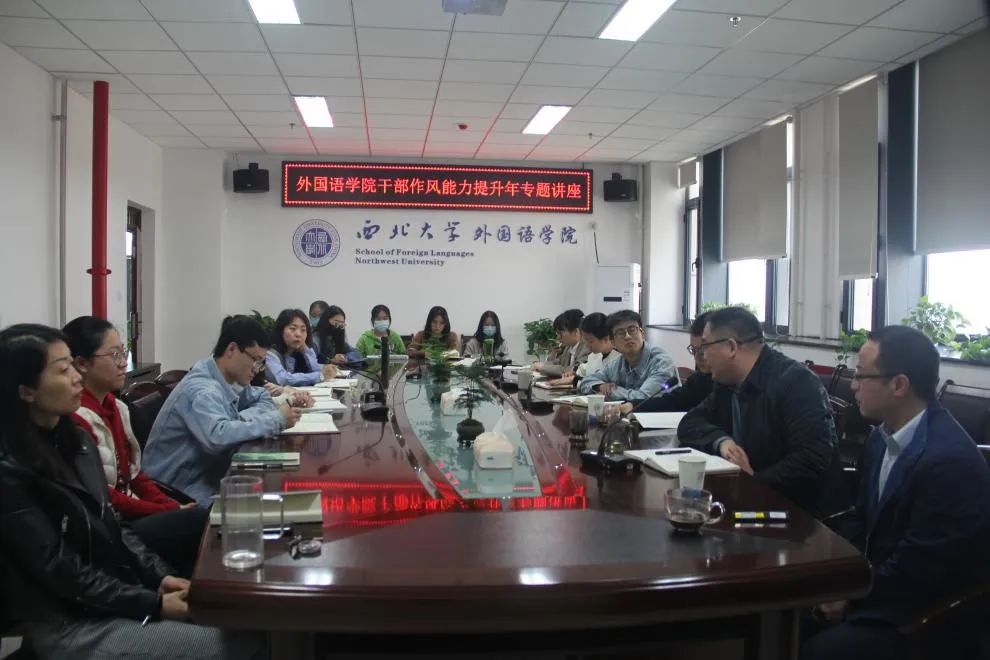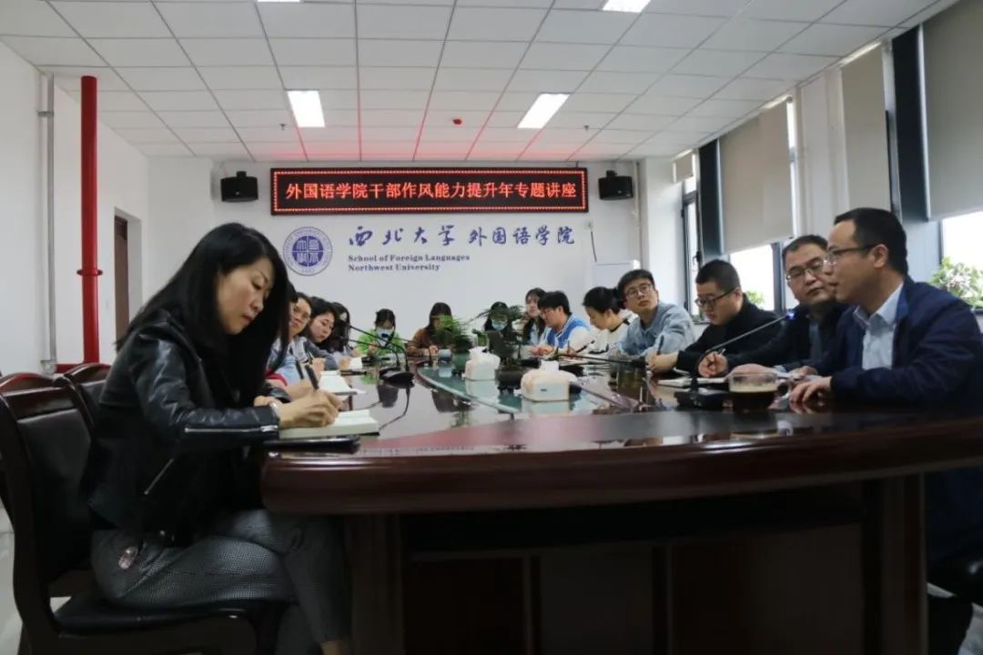 为深入贯彻落实《西北大学干部作风能力提升年实施方案》要求,按照《外国语学院党委干部作风能力提升年实施方案》安排,3月30日上午,学院党委邀请学校党委办公室、校长办公室副主任梁木作主题宣讲。学院领导班子成员、辅导员、师生代表20余人参加本次集体学习,本次讲座由学院党委副书记刘建波主持。