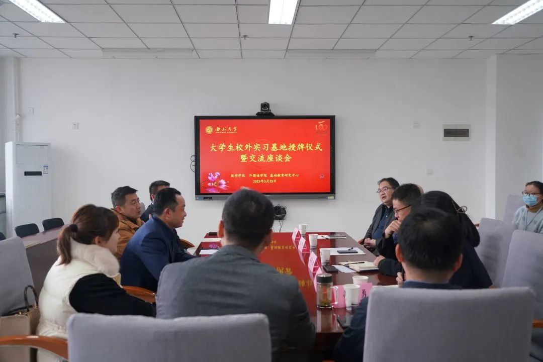 为贯彻中省关于高校毕业生就业工作的决策部署,落实就业工作“一把手”工程,主动对接用人单位,深化多方合作,3月25日上午,数学学院、外国语学院、基础教育研究中心联合承办的大学生校外实习基地授牌仪式暨访企拓岗交流座谈会在东学楼317会议室举行。西咸新区黄冈泾河学校总校长唐才畏,高新第五高级中学办公室主任马金,高新区第十一初级中学办公室主任江潮,高新区第三初级中学办公室副主任仝垚伟,外国语学院党委书记王军、副书记刘建波,基础教育研究中心常务副主任杨馥宁,数学学院党委书记李长宏、副院长邵勇以及毕业班辅导员参加了本次活动。数学学院党委副书记田和军主持仪式。