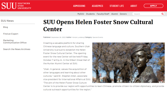 揭幕仪式由南犹他大学海伦·福斯特·斯诺文化中心主任、南犹他大学国际招生亚洲部主任欧阳文女士主持。