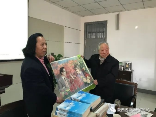 仪式上,海伦·福斯特·斯诺基金会主席Adam Foster为南犹他大学赠送旅美画家郭轶丹女士创作的绢画《忘年之交》复制品。这幅画的原件创作于2017年。郭轶丹女士在南犹他大学“海伦日”庆典时,将这幅画赠送给海伦·斯诺的“忘年之交”安危先生。回国后,安危先生将其赠送给陕西斯诺研究中心。