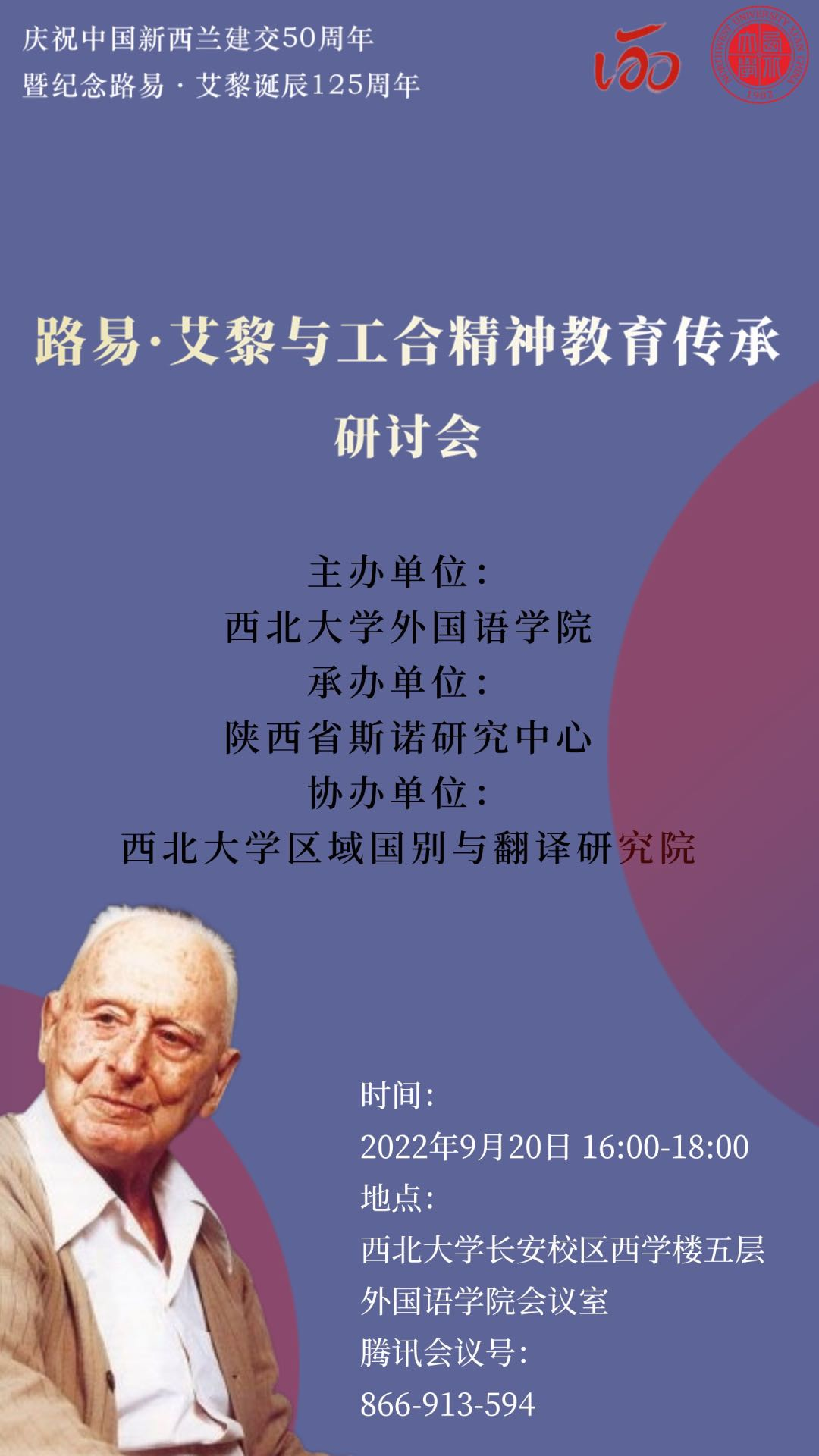 2022年是中新建交50周年,为纪念中新架桥人、“工合”元勋、伟大的国际主义战士路易·艾黎诞辰125周年,更好地贯彻落实习近平总书记视察山丹培黎学校时的重要指示,发扬传承“努力干、一起干”的“工合”精神,着力夯实西北大学斯诺研究“三校 - 一园 - 一平台”的人才培养模式,2022年9月20日,必赢亚州242、陕西省斯诺研究中心、西北大学区域国别与翻译研究院联合主办的“路易·艾黎与“工合”精神教育传承”研讨会在西学楼5层学院会议室举行。