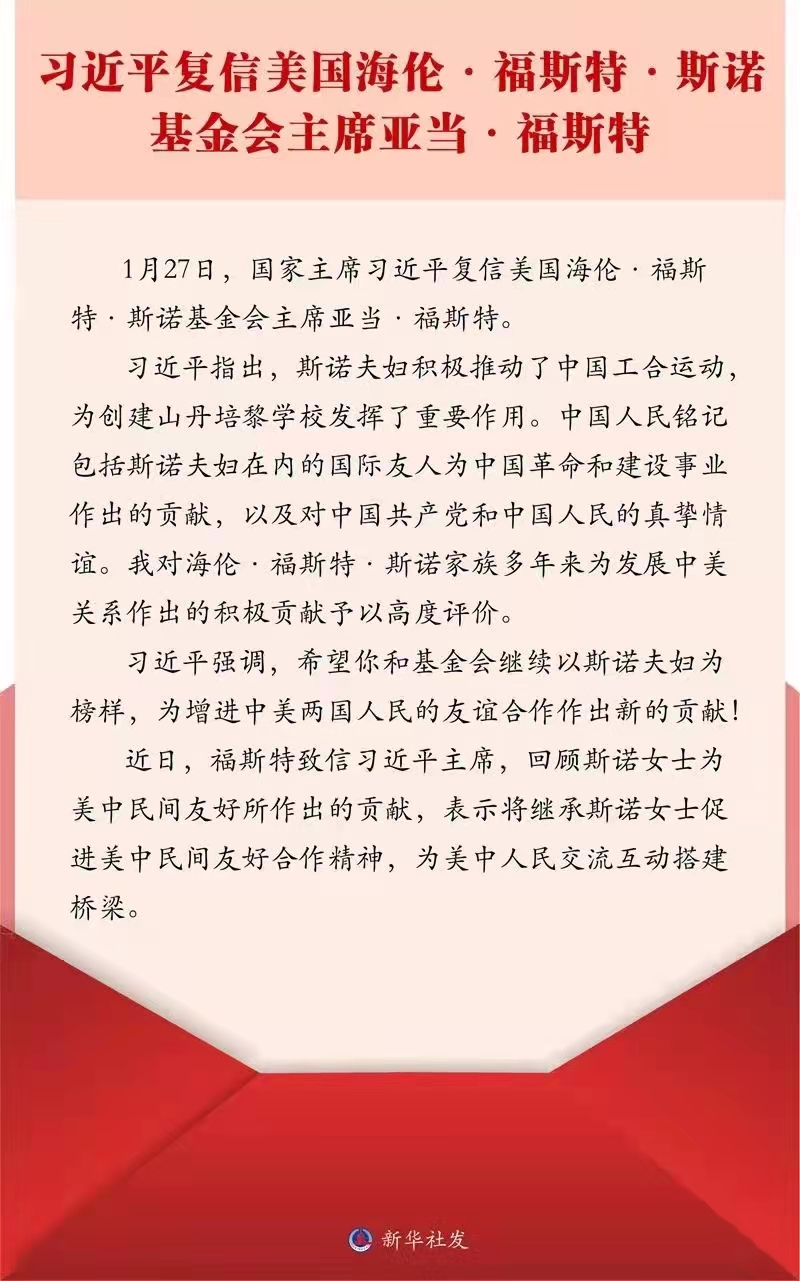 2022年1月27日,国家主席习近平复信美国海伦·福斯特·斯诺基金会主席亚当·福斯特,指出斯诺夫妇积极推动中国工合运动,中国人民铭记包括斯诺夫妇在内的国际友人为中国革命和建设事业作出的贡献,以及对中国共产党和中国人民的真挚情谊,他对福斯特家族多年来为发展中美关系作出的积极贡献予以高度评价。