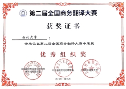 2021年7月18-19日,由全国翻译专业学位研究生教育指导委员会、中外语言文化对比研究会和上海对外经贸大学共同举办的“第二届全国商务翻译大赛”决赛和颁奖仪式在上海对外经贸大学举行。我院英语专业2018级学生王浩琛同学喜获汉译英组二等奖,于亚莉老师获优秀指导教师奖,我校获优秀组织奖。