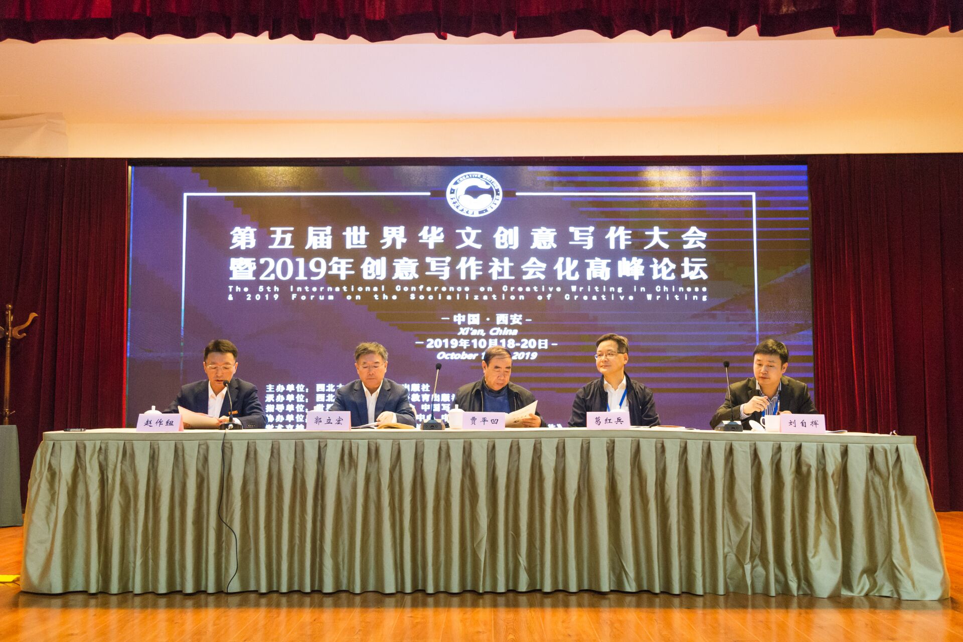 2019年10月19日上午,由西北大学、高等教育出版社联合主办,西北大学文学院承办的“第五届世界华文创意写作大会暨2019年创意写作社会化高峰论坛”开幕式在西安举行,中国作家协会副主席贾平凹、西北大学校长郭立宏、世界华文创意写作协会会长葛红兵、高等教育出版社上海出版事业部副主任刘自挥等出席开幕式并致辞,开幕式由西北大学党委副书记赵作纽主持。