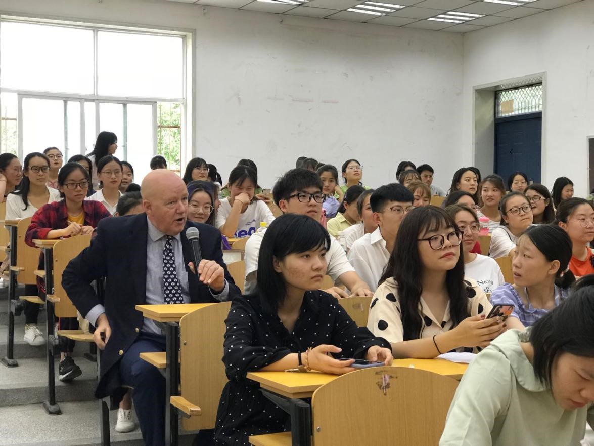 Kenneth Hunt博士的讲座主题为中美两国的贸易战。他站在非常客观的角度,分析了中美贸易战的起因及解决办法。在两个多小时的讲座中,Hunt博士邀请了多位同学参与到讲座中来,其独特的见解、幽默的语言获得了延大师生的好评。