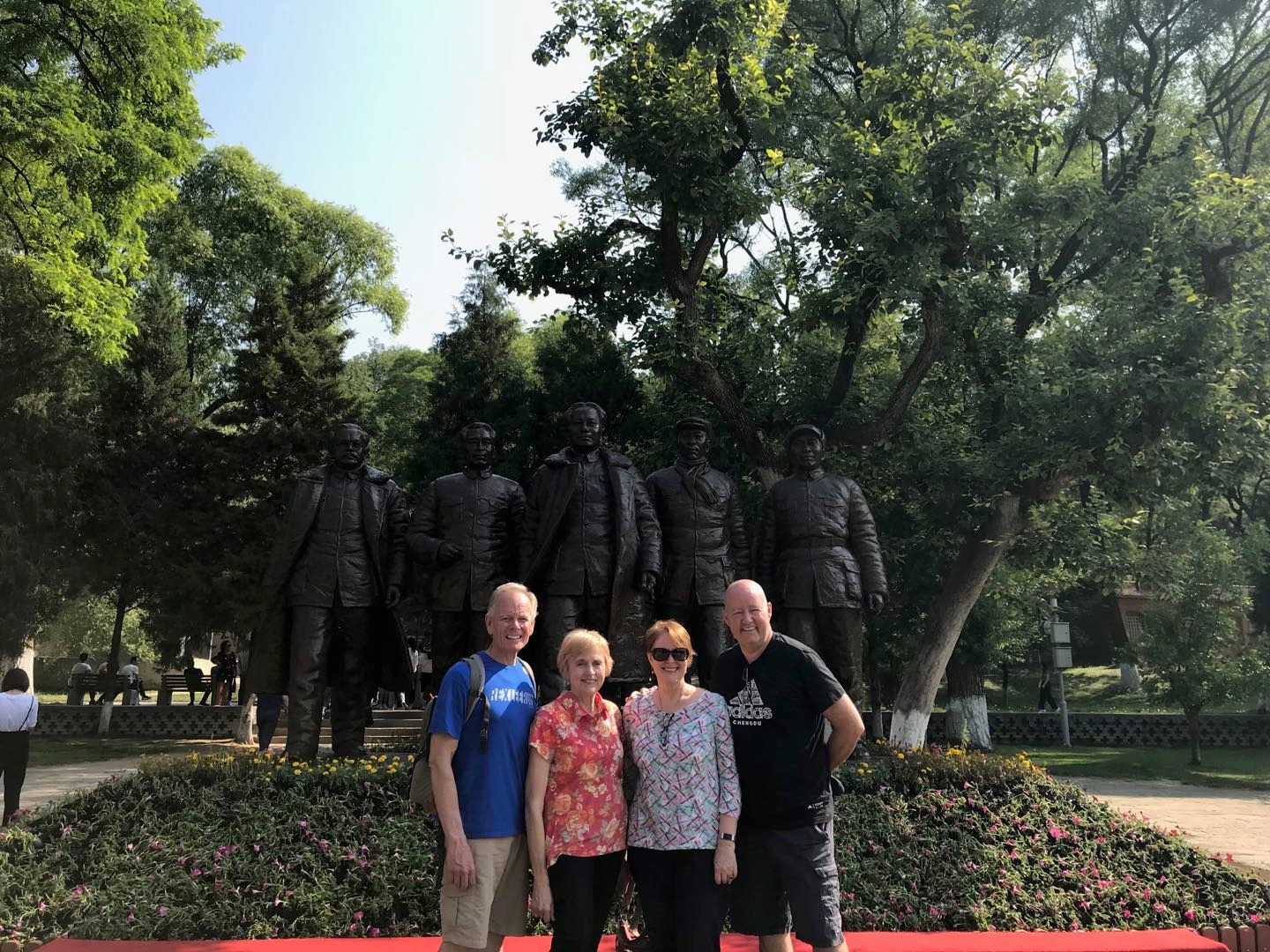 外籍专家在毛泽东、周恩来、刘少奇、朱德、任弼时五位中央书记处书记雕像前留影