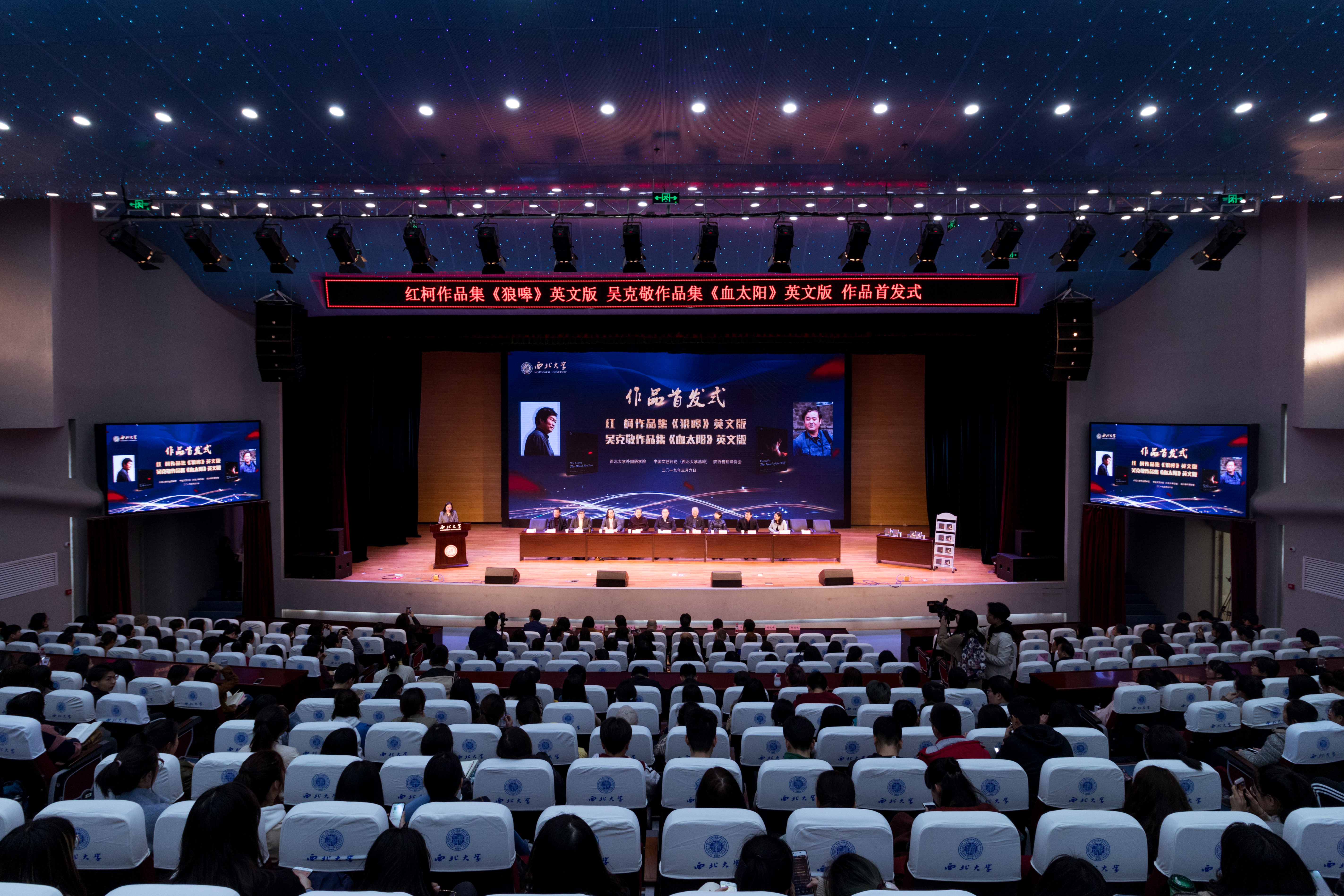 3月6日下午,由我院翻译团队编译的著名作家红柯作品集《狼嗥》英文版和著名作家吴克敬作品集《血太阳》英文版全球首发式在我校长安校区学生活动中心报告厅举行。陕西省作协副主席吴克敬,校党委常委、副校长常江出席,校内相关单位负责人和我院师生代表参加仪式。