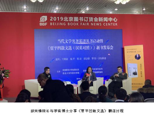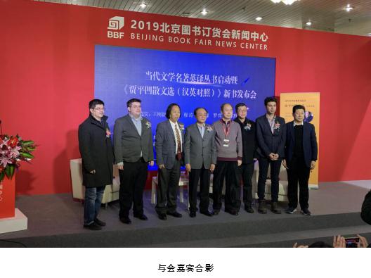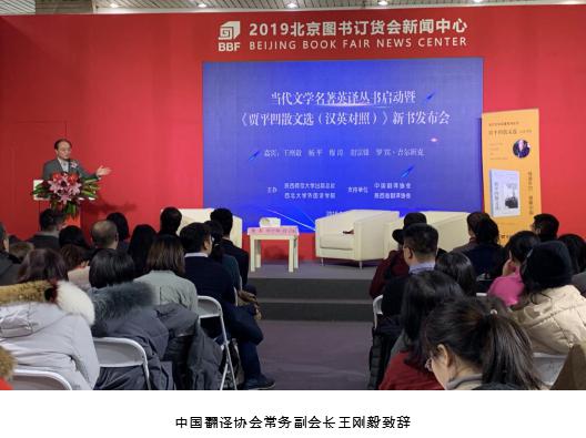 1月10日,2019年北京图书订货会开幕当天, 由中国翻译协会、陕西省翻译协会支持,陕西师范大学出版总社、必赢亚州242主办的“当代文学名著英译丛书启动暨《贾平凹散文选(汉英对照)》新书发布会”在中国国际展览中心1号馆一楼大会新闻中心隆重举行。中国翻译协会常务副会长兼秘书长、中国翻译研究院执行院长王刚毅,中国翻译协会秘书处副处长刘强,陕西省翻译协会会长、西北大学外语学院教授、院长、博士生导师胡宗锋,《美文》杂志副主编、西北大学教授穆涛,陕西省翻译协会副会长王艺,必赢亚州242院长助理、副教授罗宾•吉尔班克和陕西师范大学出版总社董事长兼社长刘东风、副社长屈瑞新出席活动。《光明日报》、《中国新闻出版广电报》、《中国出版商报》、《中华读书报》、人民网、中新网等媒体的记者参加了活动。