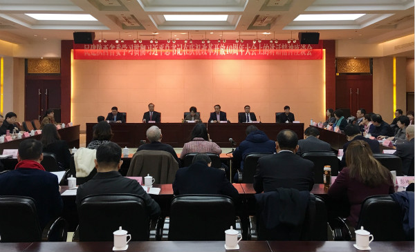 1月4日,省民建召开学习贯彻习近平总书记在庆祝改革开放40周年大会上的重要讲话精神座谈会。省政协副主席、省民建主委李冬玉出席会议并讲话。省委会委员、各专门委员会主任副主任、市级组织专职副主委、省委会监督委员会委员和机关处级以上干部参加座谈会。作为省民建理论与文化委员会副主任,我院胡宗锋教授应邀出席了本次座谈会。