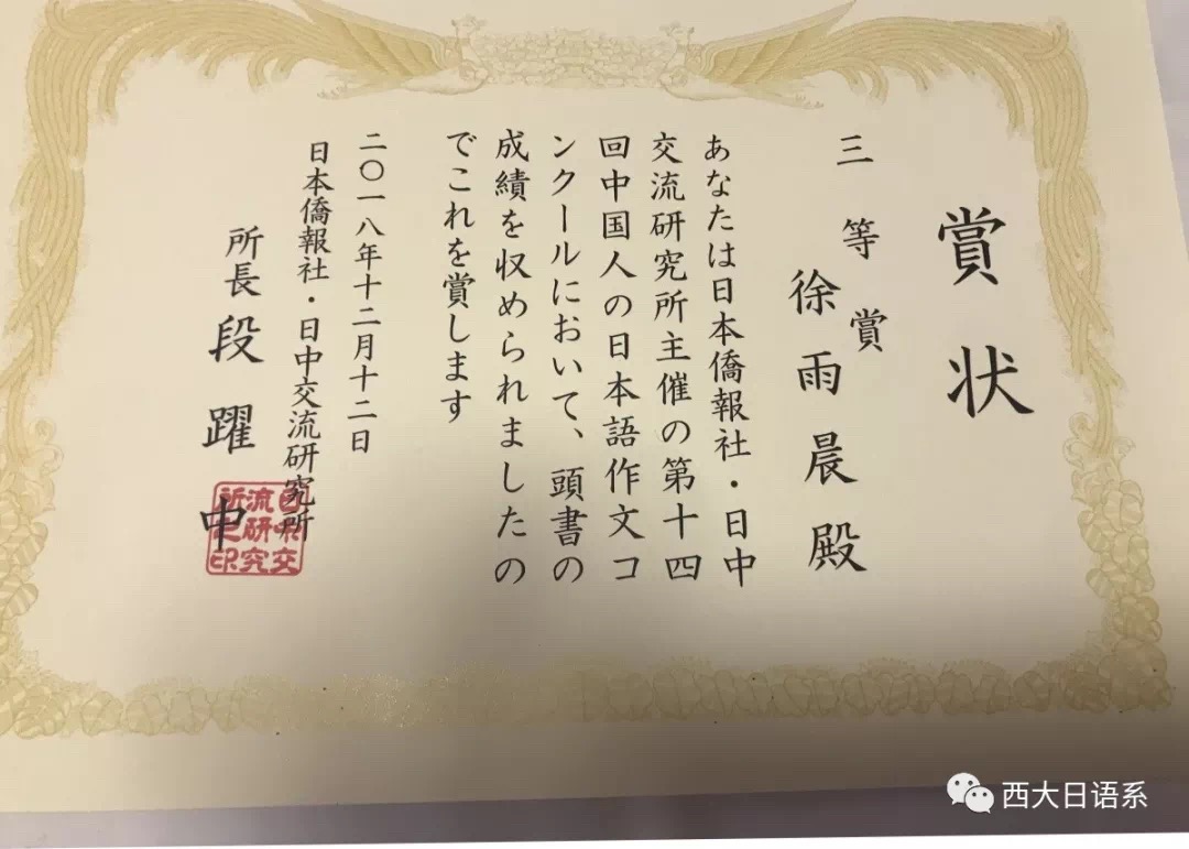 中国人日语作文大赛”举办始于2005年,每年举办一次,由日本侨报社、中日交流研究所主办,是国际上具有较大影响力的大型赛事。今年一共收到来自中国235所高校的4288篇作品,经过专家评审员的层层筛选,最终评选出81篇三等奖以上优秀作品。我院日语系一直以来积极参与此项大赛,今年取得了令人欣喜的成绩:累计有三位日语系本科生在此次大赛中入围佳作以上奖项。其中,2015级徐雨晨同学荣获全国三等奖、2015级徐亦微同学、2016级蔡晓彤同学获佳作奖。