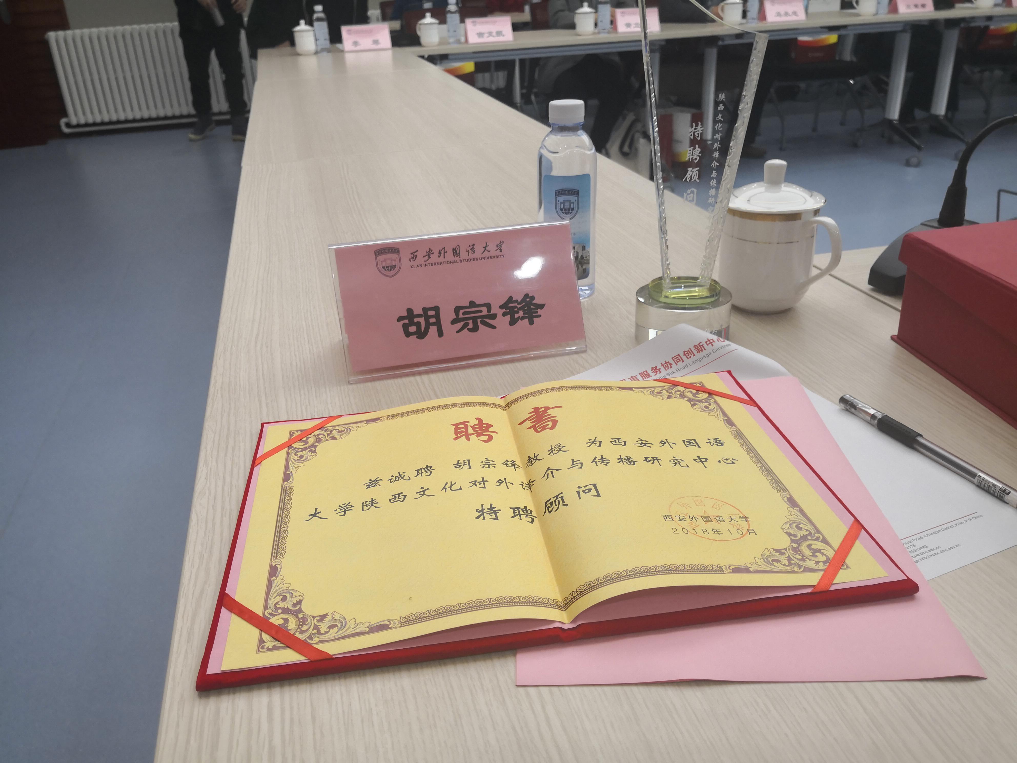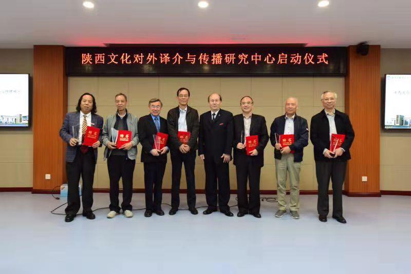 2018年10月13日,陕西文化对外译介与传播研究中心揭牌仪式暨陕西文化对外传播工程成果发布仪式在西安外国语大学雁塔校区成功举行。陕西省文化厅厅长任宗哲、中国翻译协会常务副会长黄友义、陕西省新闻工作者协会会长薛保勤、陕西省人民政府外事办公室副主任姚金川、西安外国语大学校长王军哲、副校长党争胜出席仪式,国内文化翻译领域著名学者、西安外国语大学文化译介团队等40余人参加仪式,仪式由党争胜副校长主持。 我院院长胡宗锋教授应邀出席仪式并被聘为该中心特聘顾问。