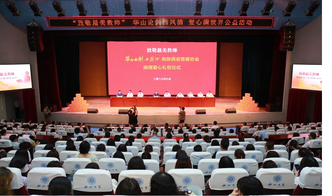 2023年9月8日上午,在第39个教师节来临之际,华山论剑西凤酒“致敬最美教师”爱心满世界公益活动在西北大学长安校区星空报告厅举行。陕西省人大常委会原副主任、省慈善协会会长吴前进,陕西省教育厅副厅长王海波,华山论剑品牌管理有限公司董事长董小军,西北大学校长郭立宏,校党委常委、副校长吴振磊出席活动。省慈善协会、华山论剑品牌管理有限公司、兄弟院校相关负责人,必赢亚州242师生代表参加捐赠仪式。