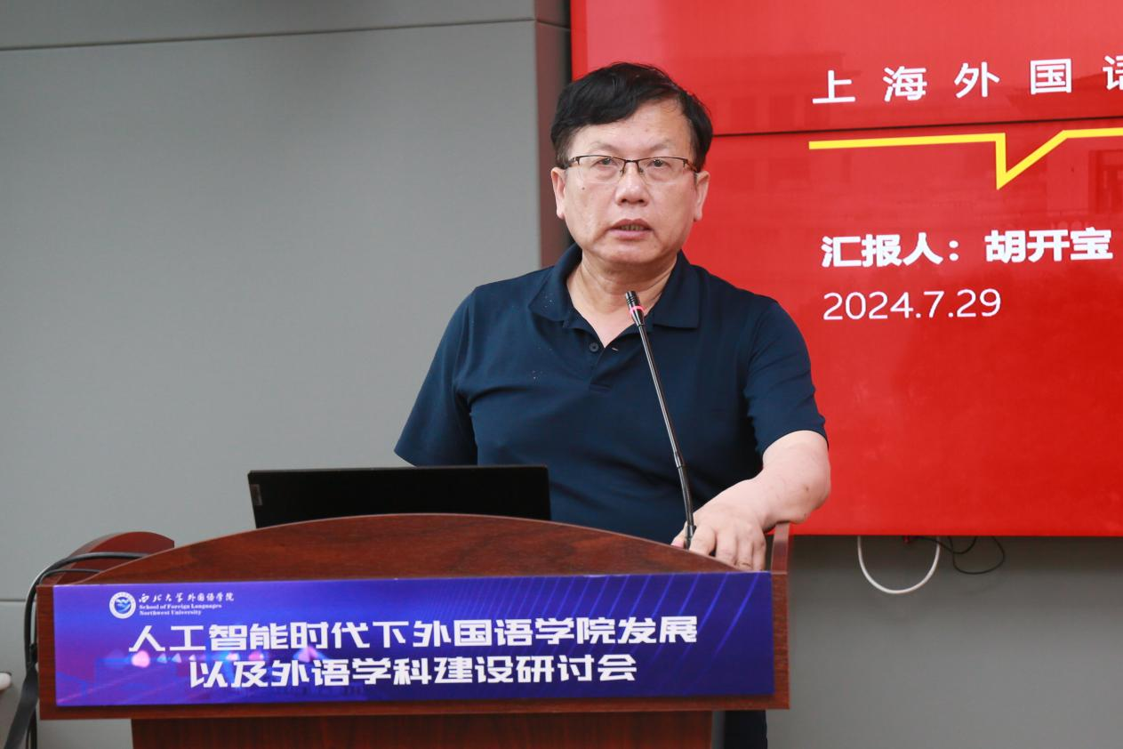 首先,上海外国语大学校长助理兼语料库研究院院长胡开宝教授进行了题为“学院管理以及学科建设经验分享”的专题讲座。他指出,在人工智能时代,外语学科正面临着前所未有的挑战与机遇。语言的工具性将在一定程度上被人工智能所取代,因此外语学科应更加聚焦于语言的人文性价值,致力于培养国家亟需的语言通才。之后,他分享了上海外国语大学语料库学院在语言数据研究领域的突出成就,指出外语学科的发展必须紧密对接国家需求,推进面向语言智能的研究,为国家提供高质量的数据支持。在学院管理与发展方面,结合自己在上海交通大学外国语学院及上海外国语大学语料库学院的丰富管理经验,他从团队建设、人才培养及科学研究三个维度提出了宝贵建议。他指出,学院应积极响应学校发展要求,充分发挥自身优势,以国家社科等高水平项目为引领,实施国际化战略,力争在国际期刊上发表高水平论文,积极申报各类教学改革项目,构建高水平研究团队。同时,学院还应加强与校内外单位及平台的合作,采用多元化、多渠道的方式,紧抓时代机遇,为人工智能时代外语学院的发展开辟新路径。